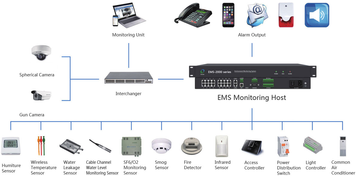 The power distribution network environment monitoring solution, which is introduced by Sunwe for the power industry, consists of EMVIEW network monitoring platform, EMS series environment monitoring host and sensors. The data application , data acquisition and data sensing are formed by this. It is a three- structure of the Internet of Things. The solution has a very remarkable characteristic of stability, security and ease of use.