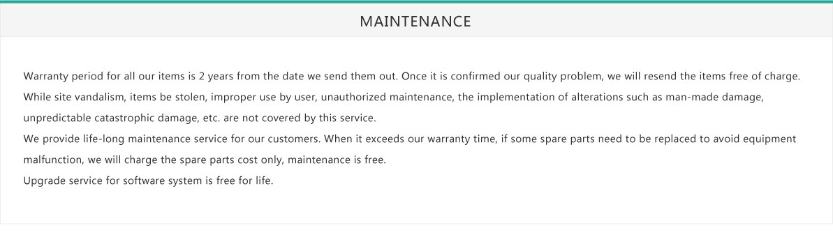 We provide life-long maintenance service for our customers. When it exceeds our warranty time, if some spare parts need to be replaced to avoid equipment malfunction, we will charge the spare parts cost only, maintenance is free.