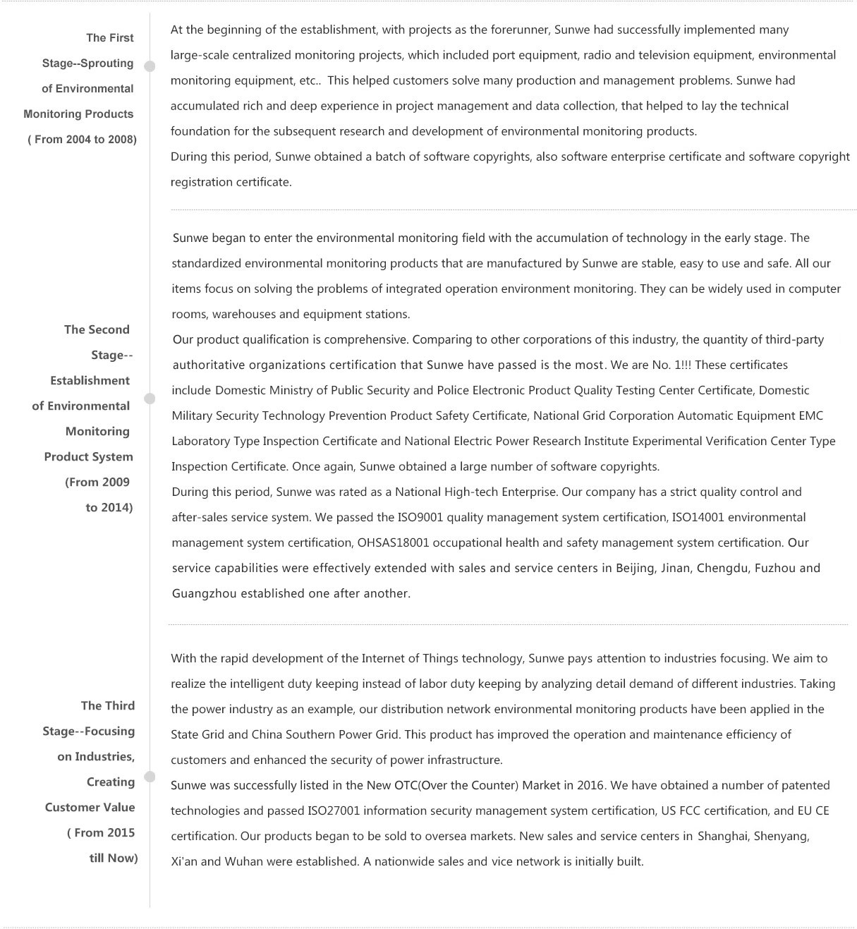 SUNWE TECHNOLOGY CO.,LTD. (stock code: 838070)is located in a beautiful coastal city, Xiamen, China. It’s founded in 2004. In the process of enterprise development, Sunwe combines its own advantages with its development opportunities. Our company has gone through three important development stages.