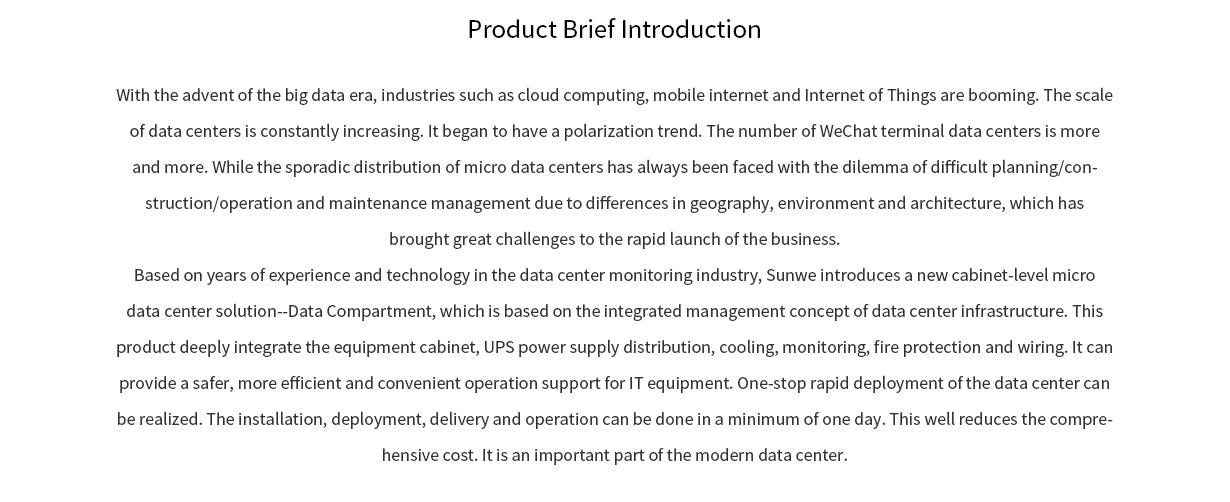 Based on years of experience and technology in the data center monitoring industry, Sunwe introduces a new cabinet-level micro data center solution--Data Compartment, which is based on the integrated management concept of data center infrastructure. This product deeply integrate the equipment cabinet, UPS power supply distribution, cooling, monitoring, fire protection and wiring. It can provide a safer, more efficient and convenient operation support for IT equipment. One-stop rapid deployment of the data center can be realized. The installation, deployment, delivery and operation can be done in a minimum of one day. This well reduces the comprehensive cost. It is an important part of the modern data center.