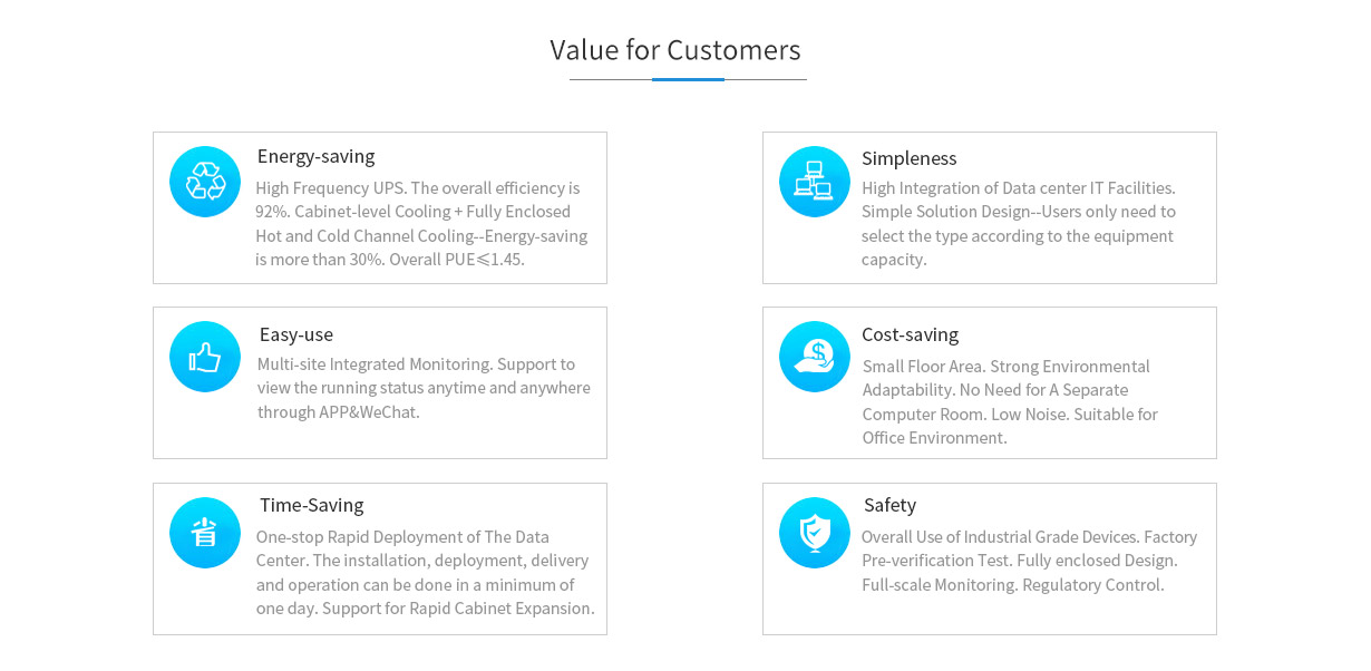 Time-Saving One-stop Rapid Deployment of The Data Center. The installation, deployment, delivery and operation can be done in a minimum of one day. Support for Rapid Cabinet Expansion. |