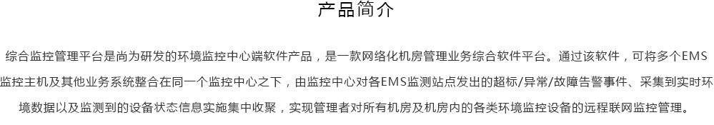 綜合監(jiān)控管理平臺(tái)是尚為研發(fā)的環(huán)境監(jiān)控中心端軟件產(chǎn)品,是一款網(wǎng)絡(luò)化機(jī)房管理業(yè)務(wù)綜合軟件平臺(tái)。通過該軟件,可將多個(gè)EMS監(jiān)控主機(jī)及其他業(yè)務(wù)系統(tǒng)整合在同一個(gè)監(jiān)控中心之下,由監(jiān)控中心對各EMS監(jiān)測站點(diǎn)發(fā)出的超標(biāo)/異常/故障告警事件、采集到實(shí)時(shí)環(huán)境數(shù)據(jù)以及監(jiān)測到的設(shè)備狀態(tài)信息實(shí)施集中收聚,實(shí)現(xiàn)管理者對所有機(jī)房及機(jī)房內(nèi)的各類環(huán)境監(jiān)控設(shè)備的遠(yuǎn)程聯(lián)網(wǎng)監(jiān)控管理。